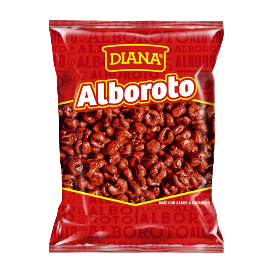 Alboroto de Diana es un snack tradicional salvadoreño de maíz inflado cubierto de caramelo, con una textura crujiente y sabor dulce. Ideal para picotear y compartir entre amigos.