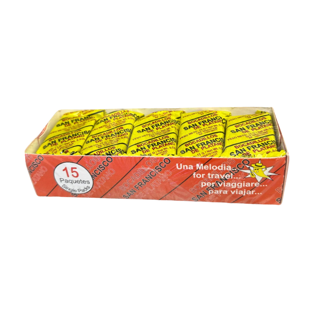 Bocadillo de plátano con sabor tradicional. Venta por unidad o caja.