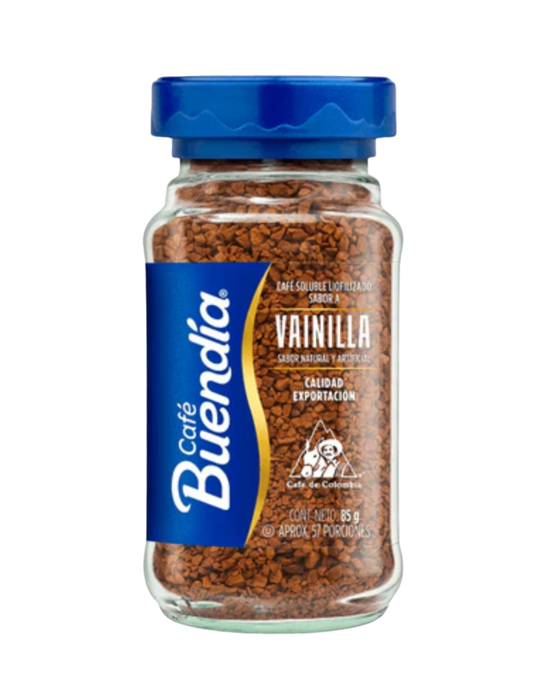 El Café Buendía de vainilla es un café instantáneo liofilizado que combina el sabor del café colombiano 100% con notas de vainilla, creando una bebida suave, dulce y aromática.