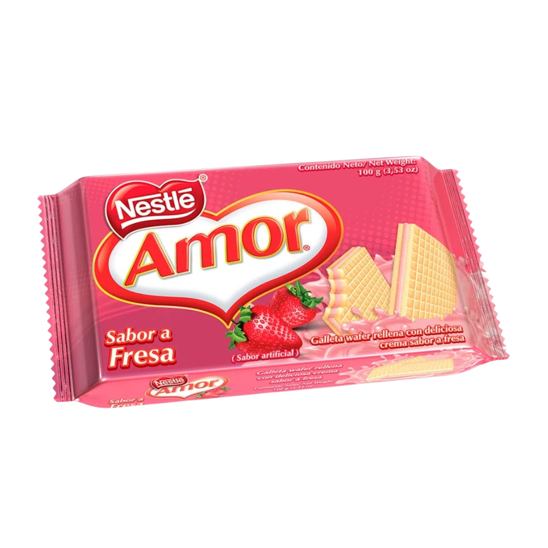 La galleta «Amor» de Nestlé en Ecuador es una galleta tipo wafer, cuadrada, con una o dos capas de obleas crujientes que envuelven una crema de sabores como vainilla, chocolate, fresa, limón y clasica.