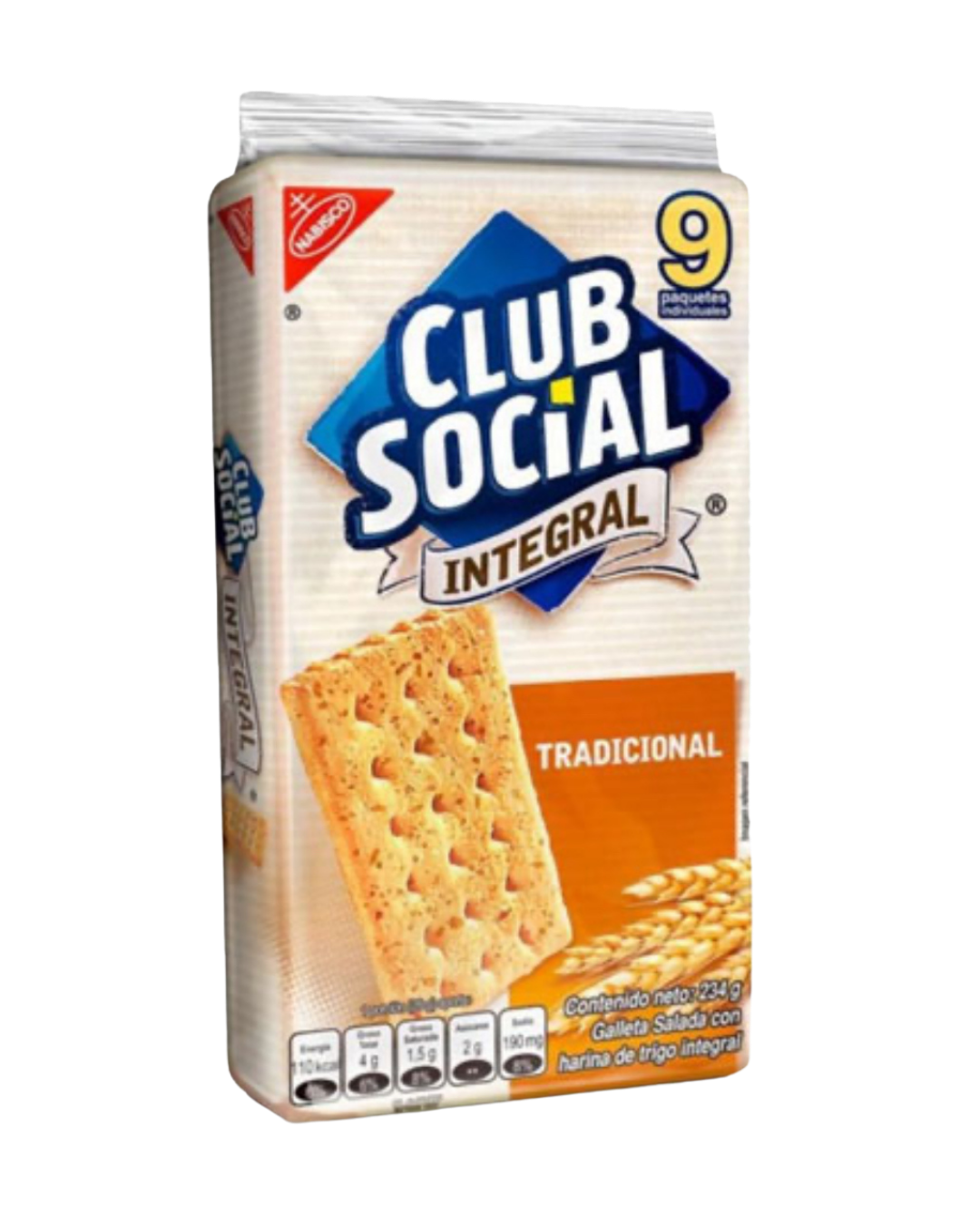 La galleta Club Social Integral es un snack salado horneado, caracterizado por su textura crujiente y sabor suave, elaborado con harina de trigo integral y salvado.