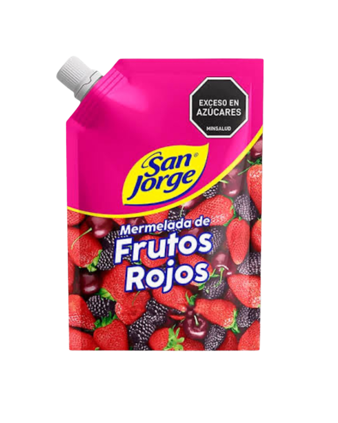 La mermelada de frutos rojos San Jorge es una conserva dulce elaborada con pulpa de fruta natural, azúcar y agua, que destaca por su color brillante y consistencia ideal para untar.